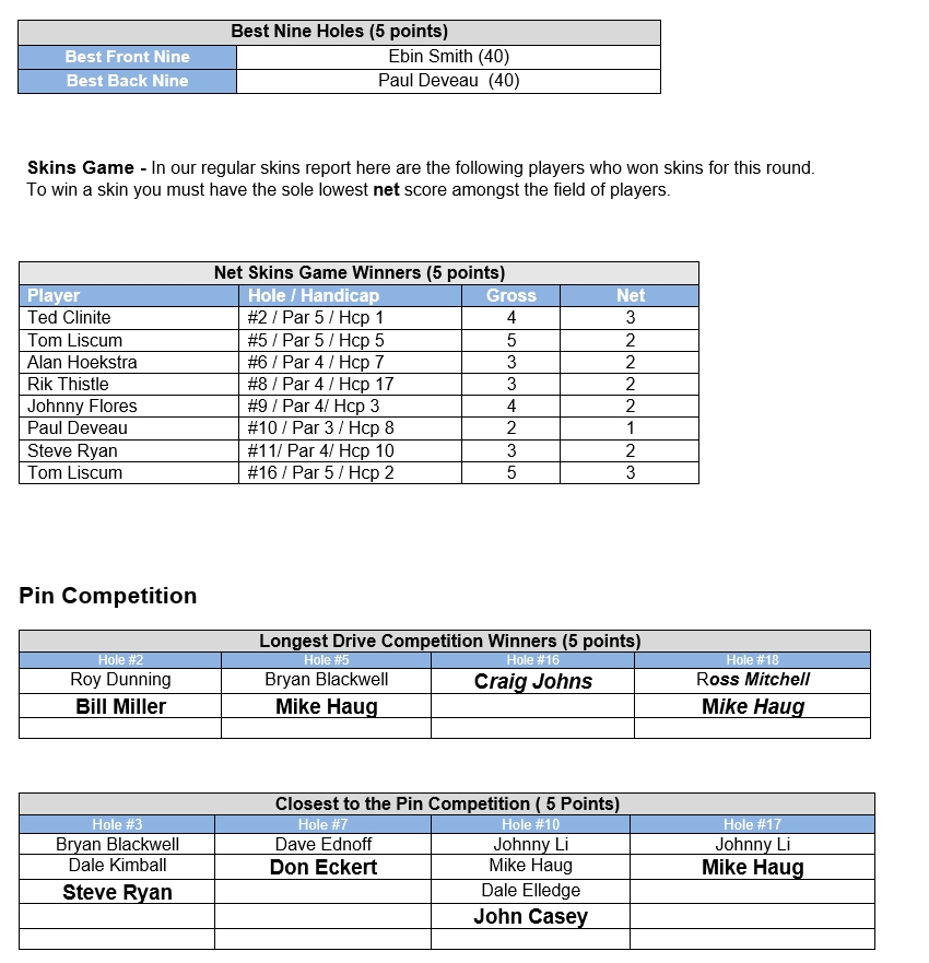 Best Nine/ Net Skins / Pin Competition Holes