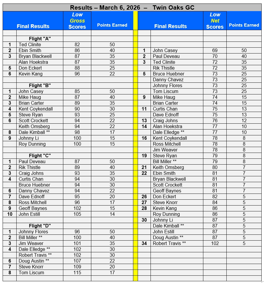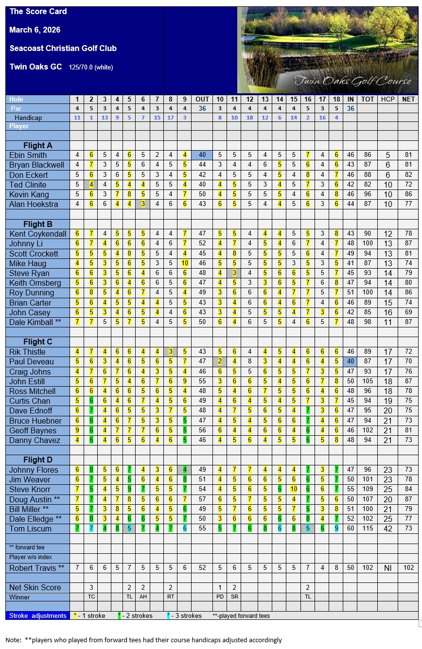 Recap Event 2 – With our third event in the books, we were challenged with a tough course here at Twin Oaks GC. Our field of players felt the challenges of this course as many got “stung” with 3 and 4 putt greens as it was reported that they were running at 12 on the stint meter. In Flight “A” Ted Clinite took charge of his game and proved that he can play under touch conditions by firing and scoring a low gross 82. John Casey (Flight B), our current 2025 Seacoast Cup Champion, came out swinging and showcased his “A” game skills with a low gross 85, to prove why he can defend his cup and again put his name on the 2026 cup. John Casey also took “LOW NET” honors with a low net score of 69. Also “staying out the rough” today was Paul Deveau who posted a low gross 87 in the “C” flight . One of our new comers this year is Johnny Flores (in Flight “D”) who posted a low gross 96 . He was able to keep his ball in play and avoided too many 3 putts today.